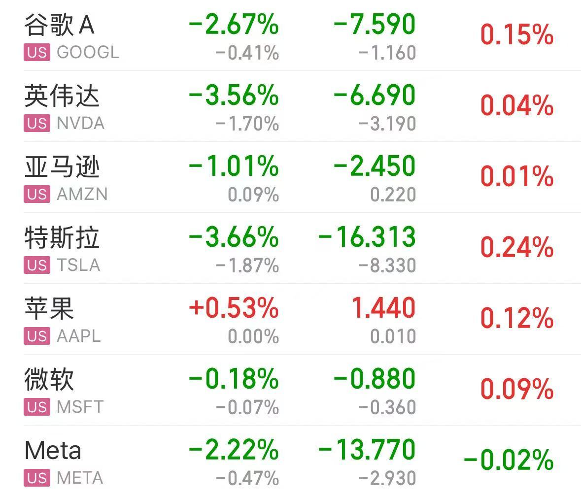 大型科技股多数下跌,英伟达、特斯拉跌超3%,谷歌、Meta跌超2%,亚马逊跌超1%,微软下跌0.18%,苹果上涨0.53%。