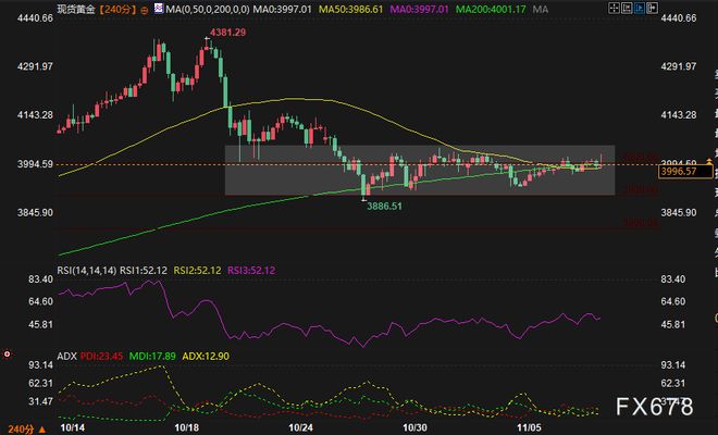 汇通财经讯——市场权衡美国政府长期停摆与全球谨慎情绪,黄金在4000美元附近持稳。交易员关注密歇根大学消费者信心数据,以寻找消费者前景的新线索。技术面展望维持中性,现货黄金受限于3900-4050美元区间,动能指标显示当前处于盘整状态。 汇通财经APP讯——周五(11月7日),现货黄金小幅走强,维持在3900-4050美元的熟悉区间内。美国政府长期停摆及全球市场的谨慎情绪,支撑避险买盘保持稳定。